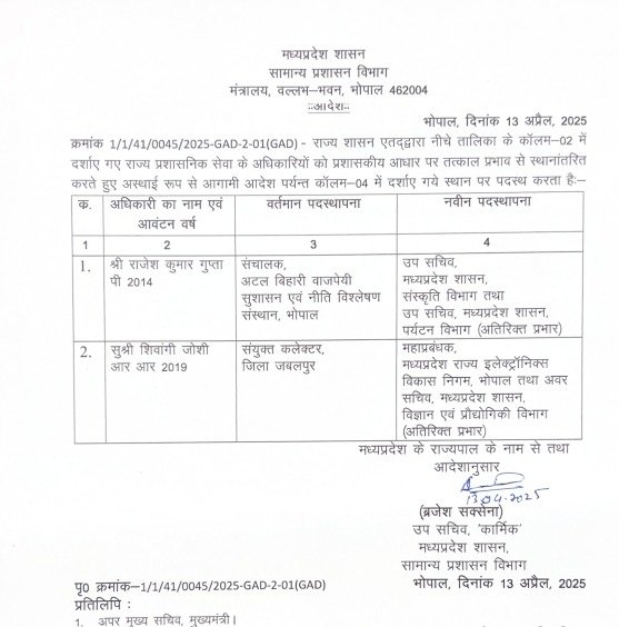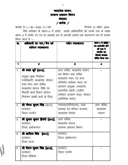 मध्य प्रदेश में 13 अप्रैल 2025 को सामान्य प्रशासन विभाग द्वारा जारी आदेशों के तहत 11 आईएएस और राज्य प्रशासनिक सेवा अधिकारियों के तबादले किए गए हैं।