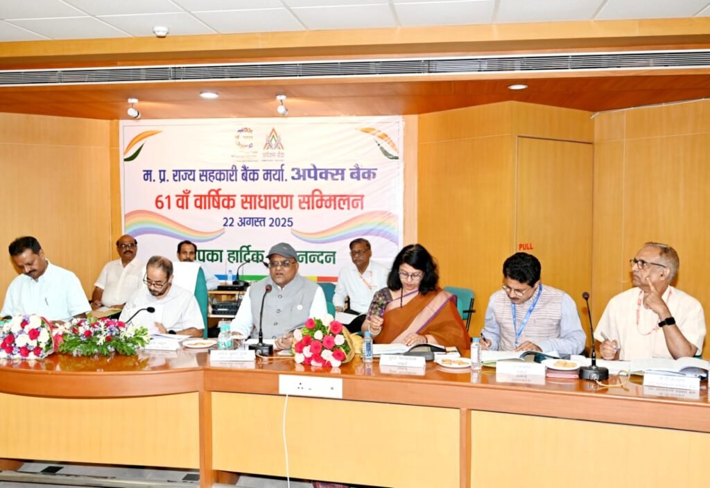 भोपाल : अपेक्स बैंक की 61 वीं वार्षिक साधारण सभा आज अपेक्स बैंक में समन्वय भवन के सभागार में म.प्र.शासन के प्रमुख सचिव, सहकारिता एवं अपेक्स बैंक के प्रशासक श्री डी.पी.आहूजा की अध्यक्षता में आयोजित हुई । बैठक के आरंभ में अपेक्स बैंक के प्रबंध संचालक श्री मनोज गुप्ता ने बैंक के प्रशासक श्री डी.पी.आहूजा, आयुक्त सहकारिता एवं पंजीयक श्री मनोज पुष्प एवं बैंक के पूर्व प्रबंध संचालक श्री प्रदीप नीखरा का पुष्प-गुच्छ से स्वागत किया ।