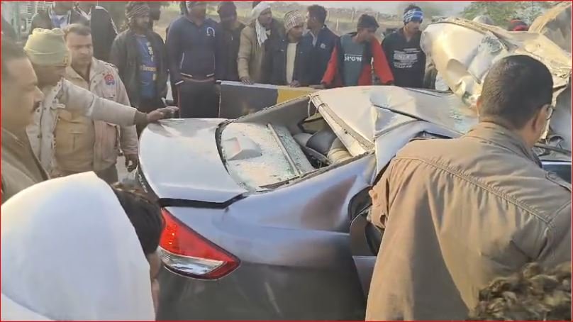 श्रध्दालुओं से भरी कार ट्रक में घुसी, पुलिस ने जेसीबी की मदद से घायलों को बाहर निकाला
