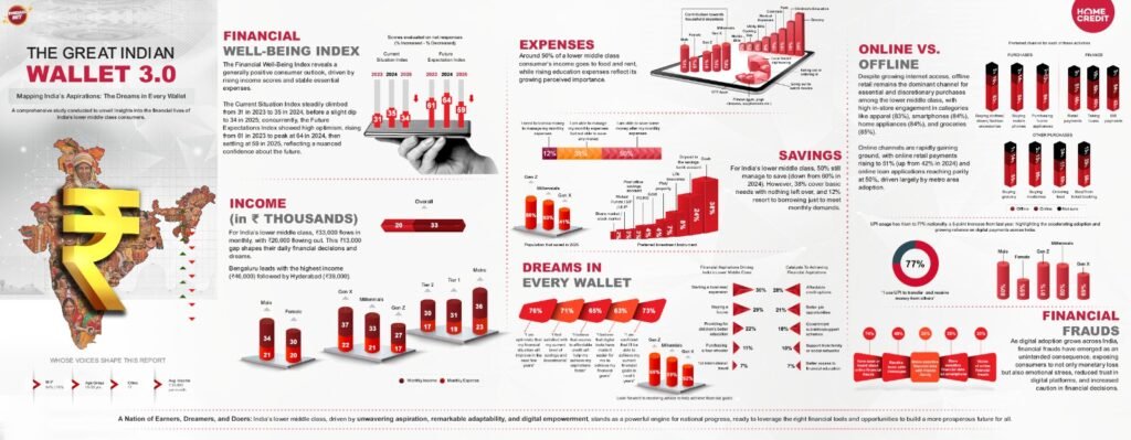 गुरुग्राम,: होम क्रेडिट इंडिया, एक अग्रणी कनज्यूमर फाइनेंस कंपनी, ने आज अपनी महत्वपूर्ण रिपोर्ट ‘द ग्रेट इंडियन वॉलेट 2025’ के तीसरे संस्करण के निष्कर्षों का अनावरण किया। इस वर्ष के अध्ययन में यह बात सामने आई है कि निम्न मध्यम वर्ग के भारतीयों की वित्तीय बेहतरी के दृष्टिकोण में एक परिवर्तनकारी बदलाव आया है। ‘मैपिंग इंडियाज एस्पिरेशन्स: द ड्रीम्स इन एवरी वॉलेट’ की थीम के साथ, यह अध्ययन देश के दो-तिहाई हिस्से का प्रतिनिधित्व करता है और एक लचीले, आशावादी और तेजी से डिजिटल हो रही आबादी की तस्वीर पेश करता है, जो न केवल जीवंत है, बल्कि अपनी आकांक्षाओं को पूरा करने के लिए फल-फूल रहा है।