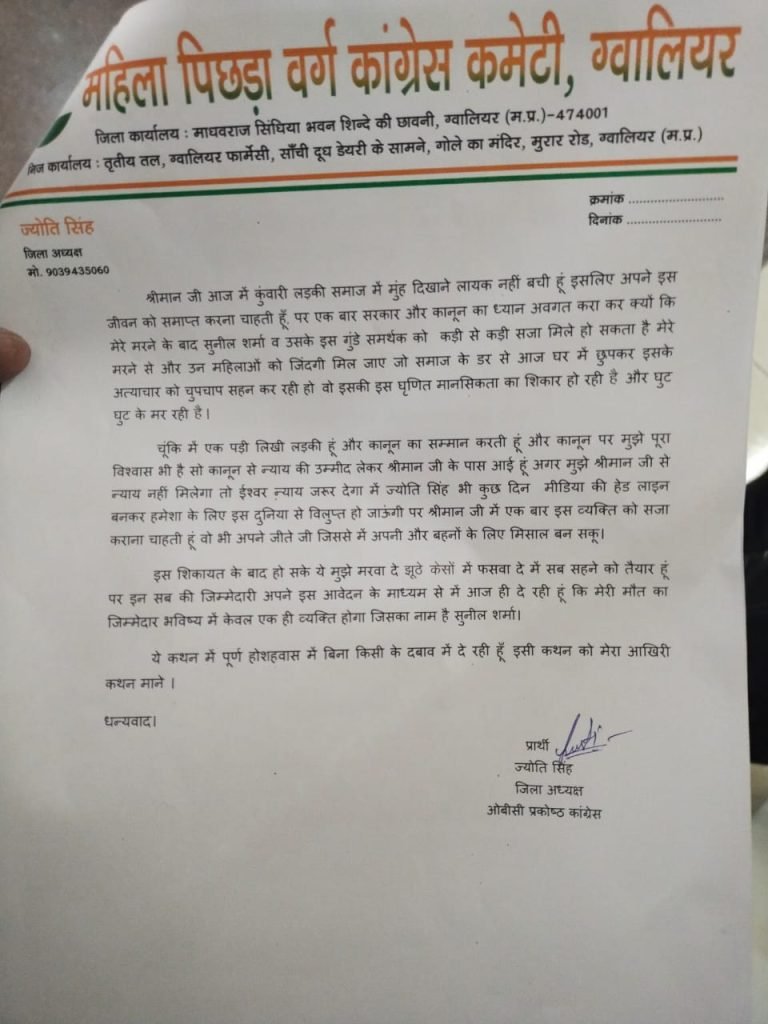ग्वालियर। कांग्रेस पार्टी की पिछड़ा वर्ग प्रकोष्ठ की महिला जिला अध्यक्ष ने प्रदेश महासचिव सुनील शर्मा पर गंभीर आरोप लगाए हैं। महिला का कहना है कि पार्षद टिकट के बदले महासचिव ने अनैतिक मांग की और 10 लाख रुपये की मांग भी रखी। इस मामले को लेकर उन्होंने एसएसपी से शिकायत दर्ज कराई है और चेतावनी दी है कि यदि एक सप्ताह में उचित कार्रवाई नहीं हुई, तो वह एसपी कार्यालय के सामने आत्मदाह कर लेंगी।