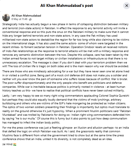 प्रो. अली खान पर आरोप है कि उन्होंने ऑपरेशन सिंदूर के दौरान प्रेस ब्रीफिंग करने वाली महिला सैन्य अधिकारियों को लेकर विवादित बयान दिया था, जिसे लेकर व्यापक विरोध हुआ। महिला आयोग की अध्यक्ष रेनू भाटिया ने इस टिप्पणी को देश की बेटियों का अपमान बताया और प्रोफेसर के खिलाफ सख्त कार्रवाई की मांग की थी। उन्होंने राज्य के पुलिस महानिदेशक को पत्र लिखकर एफआईआर दर्ज करने की अनुशंसा की थी।