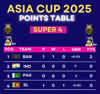 एशिया कप 2025 सुपर-4 की शुरुआत बांग्लादेश के लिए सपनों जैसी रही। अब सबकी निगाहें भारत-पाकिस्तान के मुकाबले पर टिकी हैं, जो पॉइंट्स टेबल की तस्वीर को और भी दिलचस्प बना देगा।