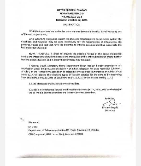 बरेली: सुरक्षा और शांति बनाए रखने के उद्देश्य से उत्तर प्रदेश शासन ने बरेली जिले में मोबाइल इंटरनेट, ब्रॉडबैंड और SMS सेवाओं को 48 घंटे के लिए बंद करने का निर्णय लिया है। उत्तर प्रदेश गृह विभाग के गोपनीय अनुभाग-3 द्वारा जारी अधिसूचना के तहत यह आदेश 2 अक्टूबर 2025 को शाम 3 बजे से प्रभावी होकर 4 अक्टूबर 2025 को शाम 3 बजे तक लागू रहेगा।