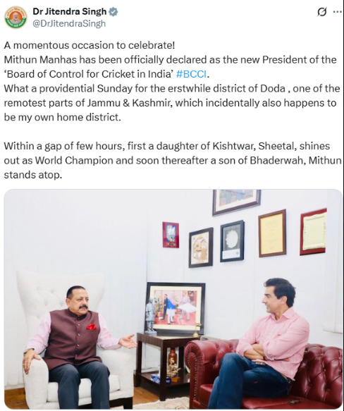 केंद्रीय मंत्री जितेंद्र सिंह ने एक्स (Twitter) पर मिथुन मन्हास के अध्यक्ष बनने की पुष्टि की। उन्होंने लिखा कि जम्मू-कश्मीर के डोडा जिले के लिए यह दिन बेहद खास है। संयोग से उसी दिन किश्तवाड़ की बेटी शीतल देवी ने विश्व चैंपियन बनकर देश का नाम रोशन किया और कुछ ही घंटों बाद मिथुन मन्हास BCCI के शीर्ष पद पर चुने गए।