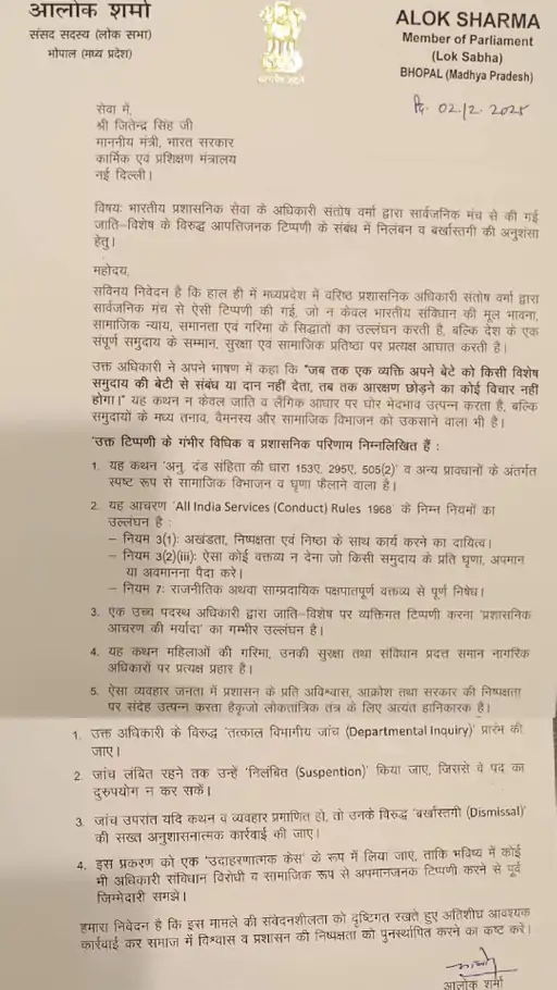 भोपाल: सांसद आलोक शर्मा ने आईएएस संतोष वर्मा द्वारा दिए गए विवादित बयान पर आपत्ति जताते हुए उनके खिलाफ अनुशासनात्मक कार्रवाई की मांग की है। उन्होंने दिल्ली स्थित संसद भवन में केंद्रीय कार्मिक एवं प्रशिक्षण विभाग के मंत्री जितेंद्र सिंह से मुलाकात कर लिखित शिकायत सौंपी। सांसद का कहना है कि वर्मा का सार्वजनिक मंच पर दिया गया बयान आईएएस सेवा नियमों के विरुद्ध है और इससे सामाजिक सौहार्द व संवैधानिक मूल्यों को ठेस पहुंचती है।