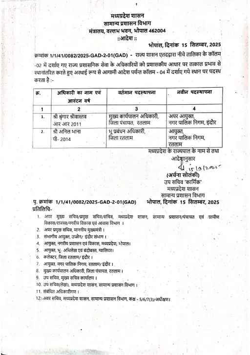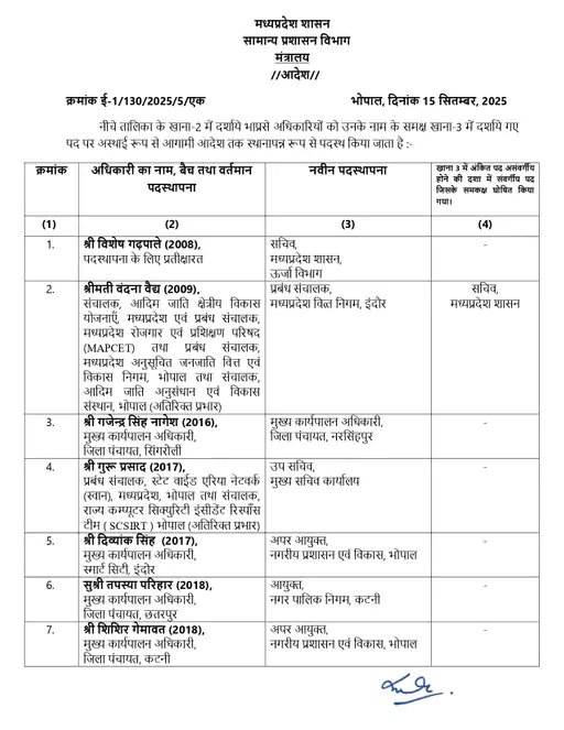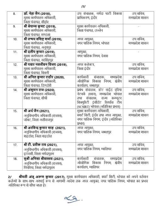 - तपस्या परिहार कटनी नगर निगम की आयुक्त बनीं, जबकि दलीप कुमार को देवास नगर निगम का कमिश्नर बनाया गया।
