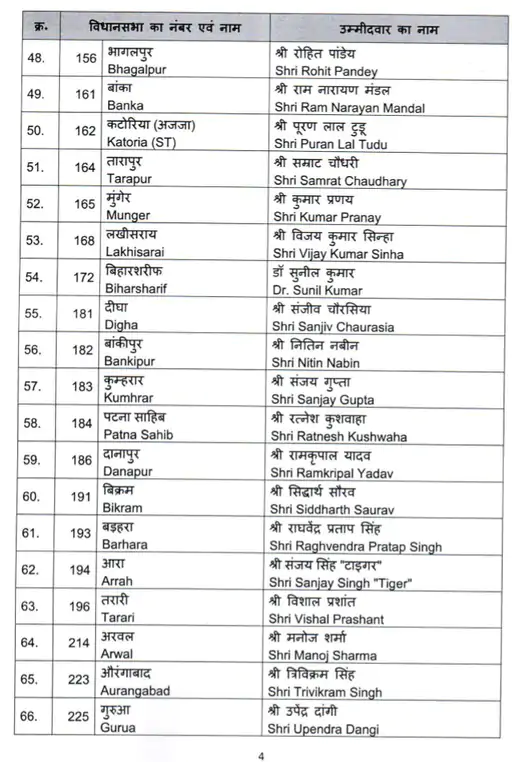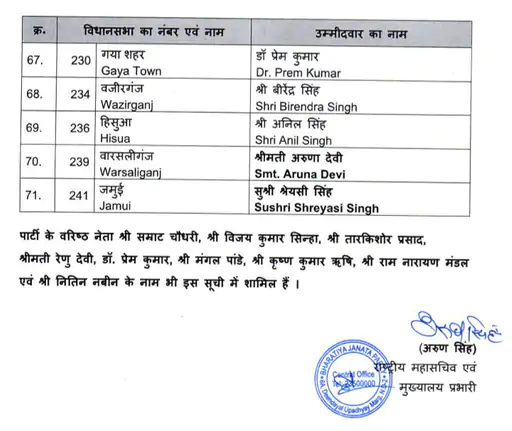 BJP releases first list of 71 candidates for Bihar Assebly elections. Deputy CM Samrat Choudhary to contest from Tarapur, Deputy CM Vijay Kumar Sinha from Lakhisarai, State Minister Nitin Nabin from Bankipur and Renu Devi to contest from Bettiah. pic.twitter.com/brXr2q2Ym7