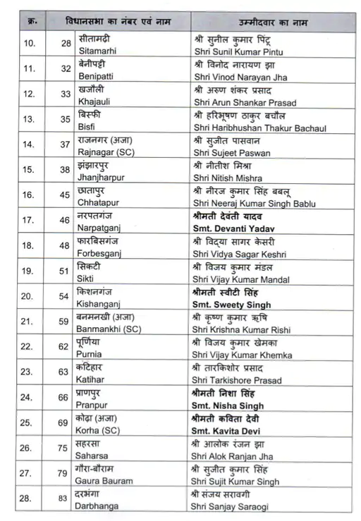 पहली सूची में कई वरिष्ठ और वर्तमान मंत्रियों को भी जगह दी गई है। इनमें मंगल पांडे, नीतीश मिश्रा, नीरज कुमार बबलू, जीवेश मिश्रा, राजू सिंह, कृष्ण कुमार मंटू, सुरेंद्र मेहता, डॉ. सुनील कुमार, संजय सरावगी और डॉ. प्रेम कुमार शामिल हैं।