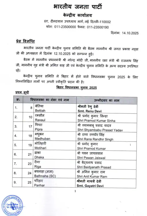 राज्य में भाजपा कुल 101 विधानसभा सीटों पर अपने उम्मीदवार उतारेगी। बिहार में 9 और 11 नवंबर को मतदान होगा, जबकि 14 नवंबर 2025 को परिणाम घोषित किए जाएंगे।