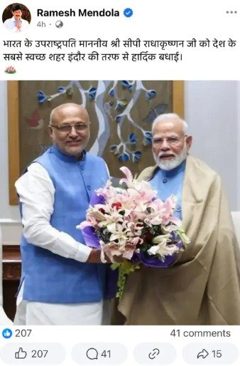 विधायक मेंदोला ने सुबह 11:35 बजे पोस्ट करते हुए लिखा— “भारत के भावी राष्ट्रपति सी.पी. राधाकृष्णन जी को स्वच्छता के लिए प्रसिद्ध इंदौर की ओर से हार्दिक शुभकामनाएँ।” दिलचस्प बात यह है कि अब तक उन्होंने इस पोस्ट को न तो एडिट किया है और न ही हटाया।