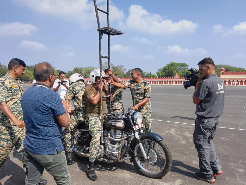 डबरा: सीमा सुरक्षा बल (बीएसएफ) की वीरता और अनुशासन का शानदार प्रदर्शन एक बार फिर इतिहास रचने जा रहा है। टेकनपुर स्थित बीएसएफ अकादमी के केंद्रीय मोटर गाड़ी प्रशिक्षण स्कूल (सी.एस.एम.टी.) में 15 नए विश्व कीर्तिमान स्थापित करने की तैयारी जोरों पर है। यह आयोजन गृह मंत्रालय, भारत सरकार के निर्देशानुसार किया जा रहा है। जानकारी के अनुसार इस भव्य कार्यक्रम में बीएसएफ की जांबाज टीम और सीमा भवानी टीम मिलकर बाइक स्टंट के क्षेत्र में कई अद्भुत रिकॉर्ड बनाएंगी। आयोजन की तैयारियां दूसरे दिन भी पूरे उत्साह के साथ जारी रहीं। बीएसएफ अकादमी के उप महानिरीक्षक डॉ. च्यवन प्रकाश मीणा ने एशिया बुक ऑफ रिकॉर्ड्स को पत्र भेजकर 28 अक्टूबर से 7 नवंबर 2025 के बीच होने वाले इस आयोजन को मान्यता देने का अनुरोध किया है। इस विशेष अवसर पर रॉयल एनफील्ड 350 सीसी मोटरबाइक पर एक से बढ़कर एक रोमांचक स्टंट प्रस्तुत किए जाएंगे। इनमें शामिल हैं..