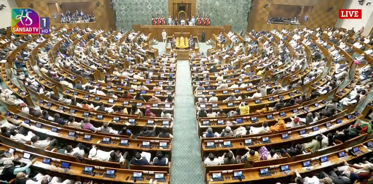 Budget Session 2026 : नारेबाजी के दौरान एनडीए समर्थक सांसदों ने मेज थपथपाकर राष्ट्रपति के अभिभाषण और प्रस्तावित कानून का समर्थन किया। वहीं विपक्षी सांसद “वापस लो, वापस लो” जैसे नारे लगाते रहे। कुछ मिनटों बाद हंगामा शांत हुआ और राष्ट्रपति का अभिभाषण आगे जारी रहा।