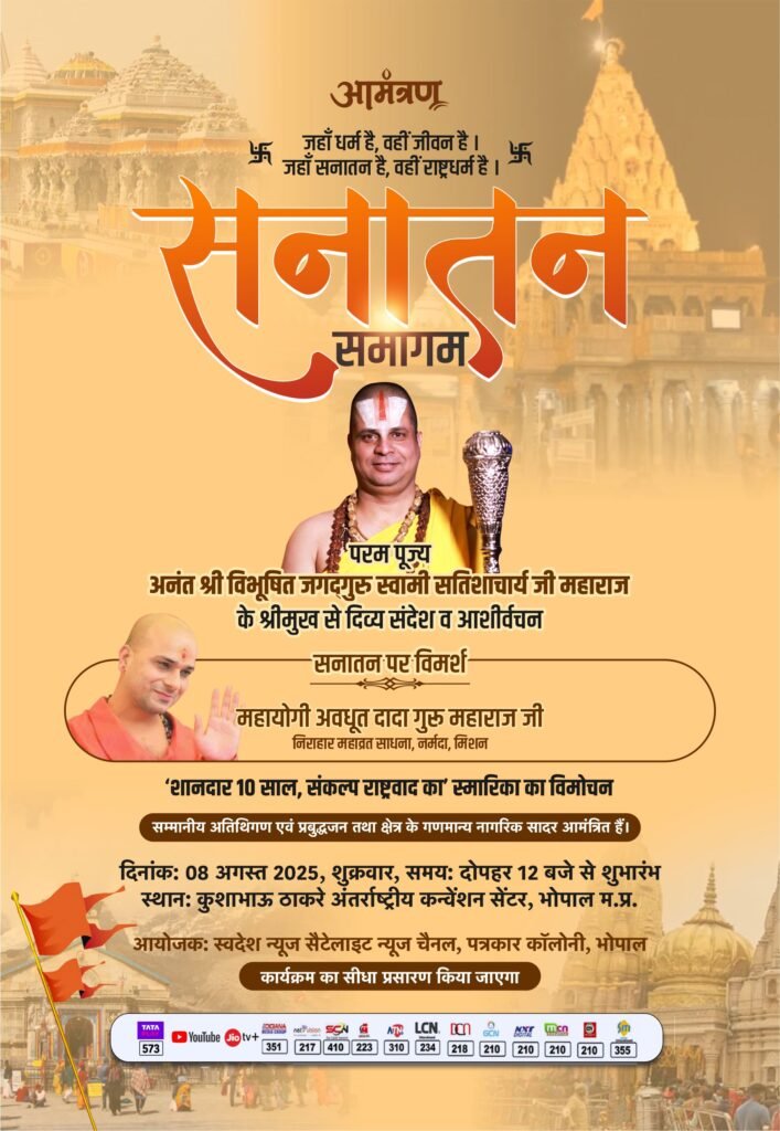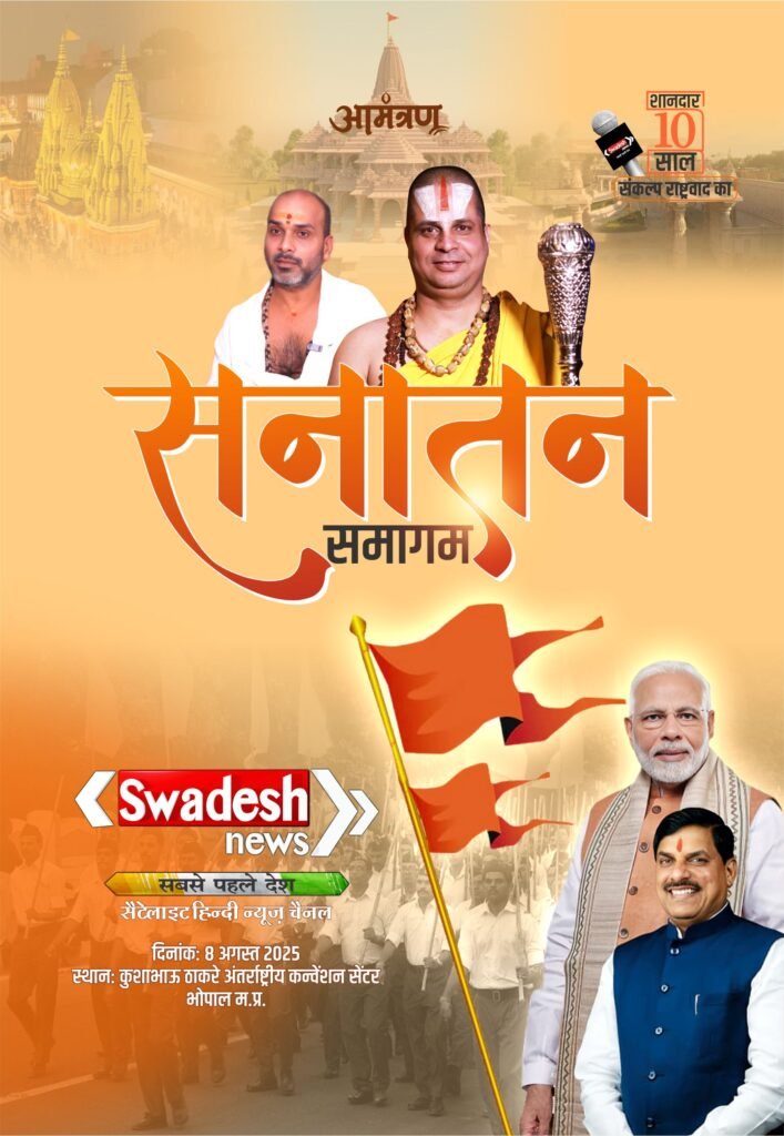 भोपाल। स्वदेश न्यूज़ ने अपनी निर्भीक पत्रकारिता और राष्ट्रवादी विचारधारा के साथ 10 गौरवशाली वर्ष पूरे कर लिए हैं। इस अवसर पर दिनांक 8 अगस्त 2025, शुक्रवार को दोपहर 12 बजे से कुशाभाऊ ठाकरे अंतर्राष्ट्रीय कन्वेंशन सेंटर, भोपाल में भव्य आयोजन ‘सनातन समागम’ का आयोजन किया जा रहा है।