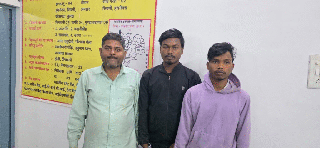 चांपा थाना क्षेत्र में हुई चोरी की बड़ी वारदात का पुलिस ने सफल खुलासा करते हुए अंतरजिला चोर गिरोह का भंडाफोड़ किया है। पुलिस और साइबर सेल की संयुक्त कार्रवाई में दो शातिर चोरों समेत चोरी का माल खरीदने वाला एक सराफा व्यापारी गिरफ्तार किया गया है। पुलिस ने आरोपियों के कब्जे से चोरी के सोने-चांदी के आभूषण और सोना गलाने के उपकरण भी बरामद किए हैं।