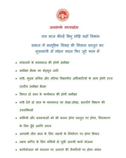 भोपाल: मुख्यमंत्री डॉ. मोहन यादव ने उज्जैन में सामूहिक विवाह समारोह में अपने बेटे का विवाह कर समाज में नई मिसाल पेश की है। बेटे के विवाह की थकान मिटाए बिना, विश्राम किए बिना यानि सामूहिक विवाह समारोह के दूसरे ही दिन मुख्यमंत्री डॉ. मोहन यादव फिर काम में जुट गए हैं। मुख्यमंत्री डॉ. मोहन यादव अपनी दो वर्ष की सरकार के काम काज का विभाग वार लेखा जोखा लेंगे और जनहित से जुड़े विकास कार्यों की समीक्षा करेंगे। मध्य प्रदेश मंत्रालय वल्लभ भवन, विधानसभा भवन और खजुराहो में अलग-अलग तारीखों में बैठक होगी। सभी मंत्री अपने दो साल के कामकाज (परफॉर्मेंस) का लेखा-जोखा रखेंगे, साथ ही अपने-अपने विभाग की उपलब्धियां बताएंगे। इसके अलावा आगामी तीन साल के रोडमैप के निर्धारण पर भी विचार विमर्श होगा। मुख्यमंत्री डॉ. मोहन यादव आगामी लक्ष्य प्राप्ति के लिए मंत्रियों से पूरी कार्ययोजना भी जानेंगे, साथ ही कार्ययोजना को धरातल पर उतारने की तैयारियों पर भी विचार विमर्श किया जाएगा। मंत्रालय से इन समीक्षा बैठकों का शेड्यूल जारी कर दिया गया है। मंत्रालय में मंत्री, मुख्य सचिव और वरिष्ठ विभागीय अधिकारियों के साथ उच्च स्तरीय समीक्षा बैठक होगी।