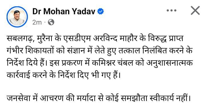 मुरैना | मुख्यमंत्री डॉ. मोहन यादव ने ग्वालियर-चंदन नगर स्थित सबलगढ़ के एसडीएम अरविंद माहौर को निलंबित कर दिया है। यह कार्रवाई मंगलवार को हुई जनसुनवाई में विवादित वीडियो सामने आने के बाद की गई। मुख्यमंत्री ने इस संबंध में अपने ट्विटर हैंडल पर जानकारी साझा की।