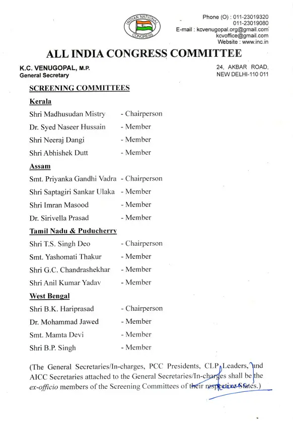 कांग्रेस ने केरल के लिए वरिष्ठ नेता मधुसूदन मिस्री को स्क्रीनिंग कमेटी का प्रमुख नियुक्त किया है। उनके साथ नासिर हुसैन, नीरज डांगी और अभिषेक दत्त को सदस्य बनाया गया है।