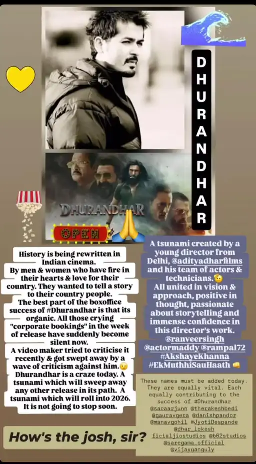 एक वायरल पोस्ट का जिक्र करते हुए आदित्य धर ने लिखा कि हाल ही में एक वीडियो मेकर ने फिल्म की आलोचना करने की कोशिश की, लेकिन वह खुद ही आलोचनाओं के सैलाब में बह गया। उन्होंने कहा कि धुरंधर इस वक्त एक लहर बन चुकी है, जो आने वाली दूसरी फिल्मों पर भी भारी पड़ रही है।