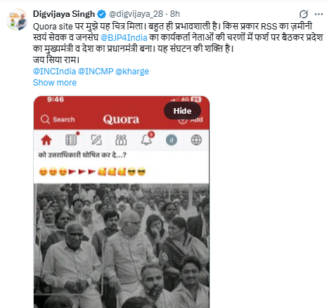 Digvijay Singh: उन्होंने आगे लिखा कि किस प्रकार संघ का जमीनी स्वयं सेवक और जनसंघ बीजेपी का कार्यकर्ता नेताओं के चरणों में फर्श पर बैठकर प्रदेश का मुख्यमंत्री और देश का प्रधानमंत्री बना। ये बीजेपी संगठन की शक्ति है। दिग्विजय सिंह की इस पोस्ट के राजनीतिक गलियारों में तरह-तरह के मायने निकाले जा रहे हैं। कांग्रेस के भीतर भी नई बहस शुरू हो गयी है।
