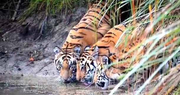 सामने आए वीडियो में साफ देखा जा सकता है कि तीनों बाघ तालाब के किनारे बेफिक्र अंदाज़ में पानी पी रहे हैं। किसी तरह की हलचल या आक्रामकता के बिना, वे शांत चाल में पानी पीने के बाद धीरे-धीरे आसपास की झाड़ियों में खो जाते हैं।
