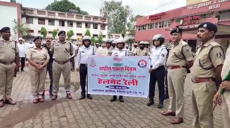 दुर्ग: लौह पुरुष सरदार वल्लभ भाई पटेल की 150वीं जयंती के अवसर पर पूरे जिले में ‘राष्ट्रीय एकता दिवस’ का संदेश दिया गया। इस मौके पर दुर्ग यातायात विभाग ने एक अनोखी पहल करते हुए हेलमेट रैली का आयोजन किया। इसका उद्देश्य लोगों में राष्ट्रीय एकता और सड़क सुरक्षा दोनों के प्रति जागरूकता फैलाना था।