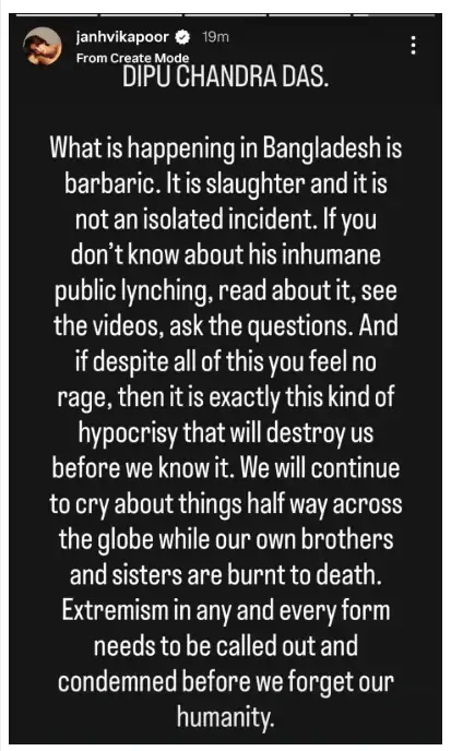 25 दिसंबर को इंस्टाग्राम स्टोरी के जरिए जाह्नवी कपूर ने लोगों से इस घटना के बारे में जानने, सवाल उठाने और चुप्पी तोड़ने की अपील की। उन्होंने कहा कि अगर इस तरह की अमानवीय लिंचिंग देखकर भी गुस्सा नहीं आता, तो यही उदासीनता इंसानियत को खत्म कर देगी।