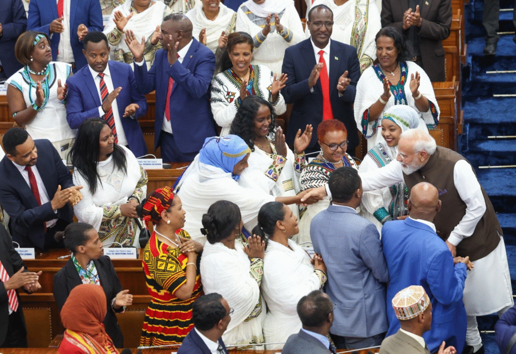 EthiopiaParliament: प्रधानमंत्री नरेंद्र मोदी जब इथियोपिया की संसद को संबोधित करने के लिए खड़े हुए, तो सभागार देर तक तालियों की गड़गड़ाहट से गूंजता रहा। इस दौरान पीएम मोदी को इथियोपिया के सर्वोच्च नागरिक सम्मान ‘ग्रेट ऑनर निशान ऑफ इथियोपिया’ से भी सम्मानित किया गया। प्रधानमंत्री ने यह सम्मान हाथ जोड़कर विनम्रता के साथ स्वीकार करते हुए कहा कि यह उनका नहीं, बल्कि भारत के 140 करोड़ नागरिकों का सम्मान है।