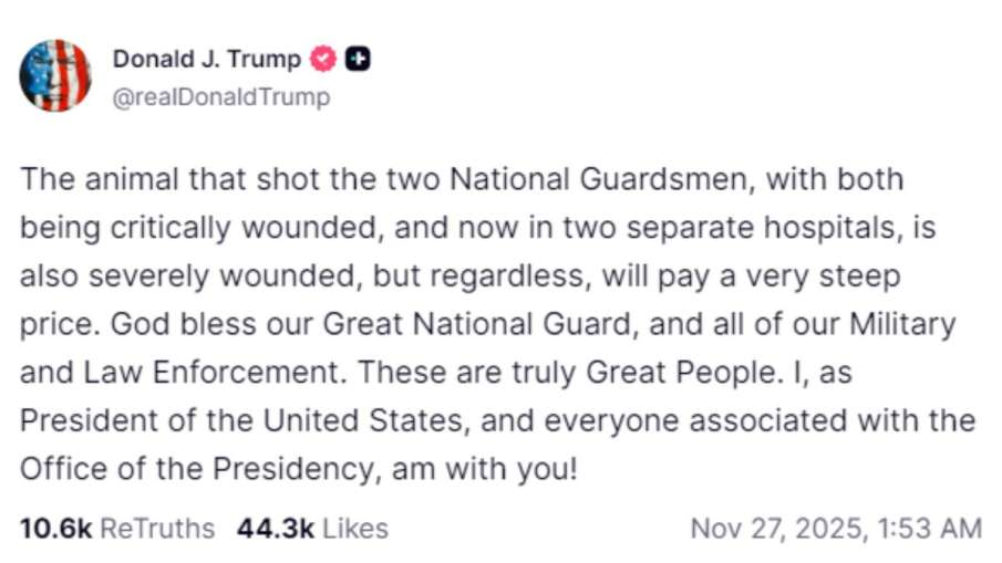 “जिस जानवर ने दो नेशनल गार्ड्समैन को गोली मारी, उसे भारी कीमत चुकानी पड़ेगी। दोनों गंभीर रूप से घायल हैं और अलग-अलग अस्पतालों में भर्ती हैं।”
