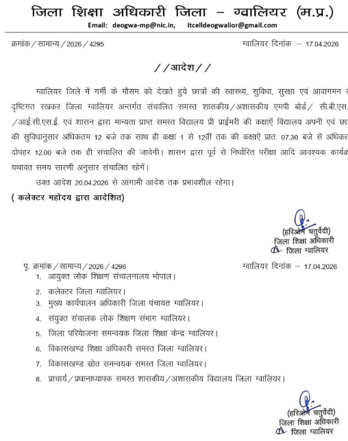 कलेक्टर द्वारा जारी निर्देशों के अनुसार, ग्वालियर जिले के सभी सरकारी और निजी स्कूलों में कक्षा 1 से लेकर 12वीं तक की कक्षाएं अब दोपहर 12:00 बजे तक ही संचालित की जा सकेंगी। दोपहर 12 बजे के बाद किसी भी स्कूल में शैक्षणिक गतिविधियां नहीं होंगी, ताकि बच्चे कड़ी धूप शुरू होने से पहले सुरक्षित अपने घर पहुँच सकें।