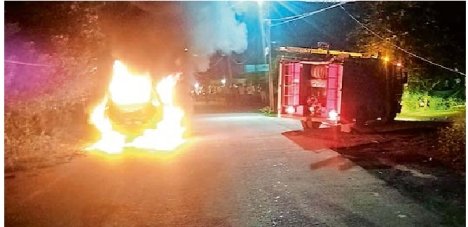 धुआं उठता देख कार में बैठे चारों लोग तुरंत बाहर निकल गए। कुछ ही क्षणों में कार में आग भड़क उठी और पूरी तरह लपटों में घिर गई।