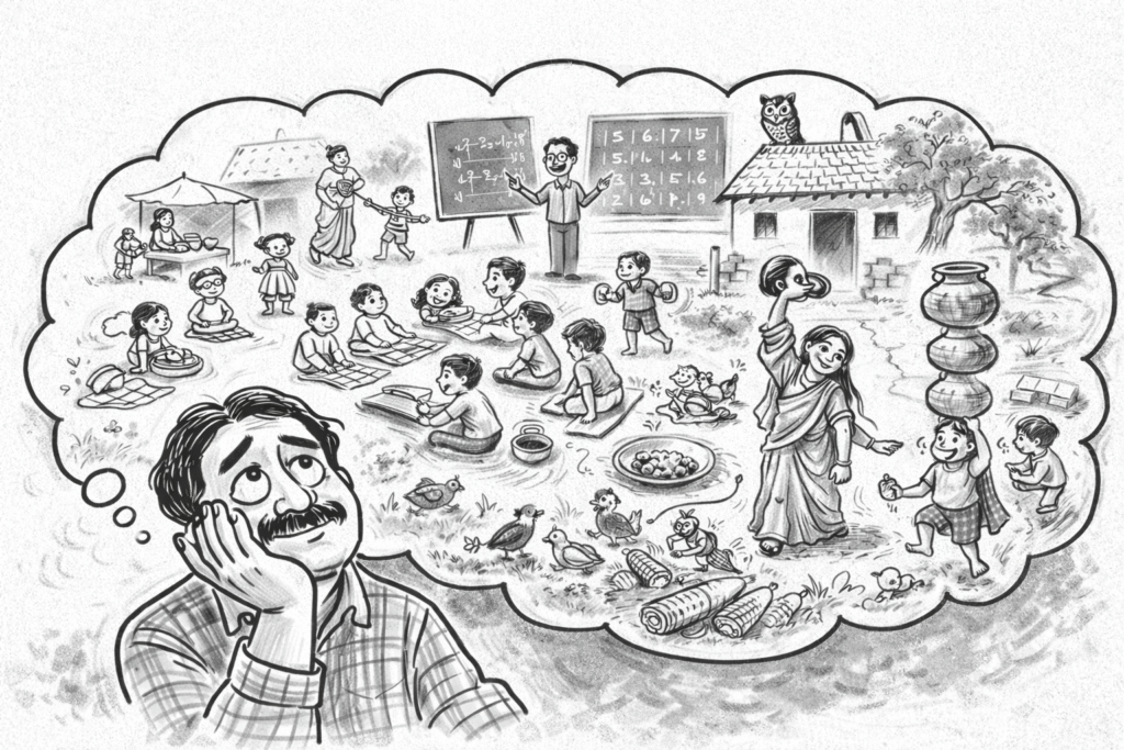स्कूल के बाहर चाट वाली चाची, बैर का चूरा, कबीट का जर्दा, स्कूल का टाट का पर्दा, छोटे गुरूजी का रूल, बड़े गुरूजी नशे में चूर। रटत पहाड़ा, दो एकम दो, दो दुनी चार, दो तिया छह, गिनती एक पे एक ग्यारह, एक पे दो बाहर, एक पे तीन तेरह, का के कै अं अ: मुंह में दही जमा, कबड्डी, कबड्डी, उतर गई तेरी चड्डी, भाग छछुंदर भाग, तेरी मां ने बनाई सरसों की साग।