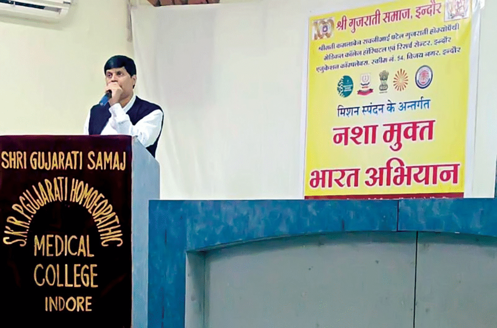 इंदौर। श्रीमती कमलाबेन रावजीभाई पटेल गुजराती होम्योपैथिक मेडिकल कॉलेज में “नशा मुक्ति अभियान” के तहत एक प्रेरणादायक कार्यक्रम का आयोजन किया गया। कार्यक्रम में प्राचार्य डॉ. एस. पी. सिंह ने विद्यार्थियों को संबोधित करते हुए कहा कि नशा व्यक्ति के जीवन, परिवार और समाज – तीनों को भीतर से कमजोर करता है। उन्होंने छात्रों को नशा-मुक्त जीवन अपनाने और दूसरों को भी प्रेरित करने का संकल्प दिलाया।