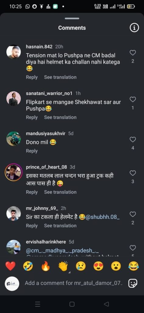 इस वीडियो को अब तक 22 मिलियन से अधिक बार देखा जा चुका है। इंस्टाग्राम पर यूजर्स ने इसे लेकर कई तरह की टिप्पणियां कीं है। एक यूजर ने लिखा, “ऑन-ड्यूटी सिगरेट पीने पर 1000 रुपये का फाइन होना चाहिए।” दूसरे ने पूछा, “इनका हेलमेट कहां है?” किसी ने मजाकिया अंदाज में कहा, “शेखावत सर की नौकरी गई अब।” वहीं, एक अन्य ने लिखा, “नकली चंदन पकड़ने के चक्कर में डिमोशन हो गया।”