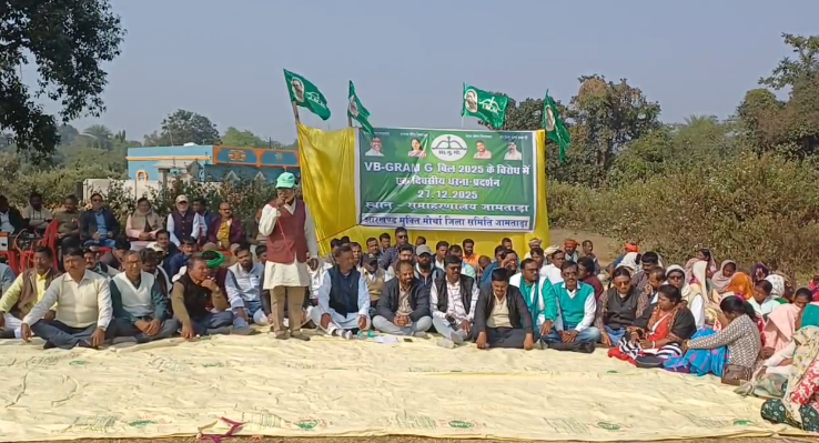 Jamatara News: झारखंड मुक्ति मोर्चा की केंद्रीय कमेटी के आह्वान पर शनिवार को जिला इकाई ने समाहरणालय के समक्ष एकदिवसीय धरना दिया। यह विरोध केंद्र सरकार द्वारा लाए गए VB-G RAM G बिल के खिलाफ किया गया। धरना की अगुवाई जिला अध्यक्ष नरेंद्र मुर्मू ने की, जबकि कार्यक्रम का संचालन वरिष्ठ नेता प्रो. कैलाश प्रसाद साव ने किया। अपने संबोधन में नरेंद्र मुर्मू ने कहा कि मनरेगा से महात्मा गांधी का नाम हटाकर लाया गया यह नया कानून मजदूरों के हितों पर सीधा हमला है। जिला सचिव परेश यादव ने केंद्र सरकार पर तानाशाही रवैया अपनाने का आरोप लगाते हुए कहा कि झामुमो गरीबों, आदिवासियों और पिछड़े वर्गों के अधिकारों के लिए संघर्ष करता रहेगा। बिल वापस होने तक आंदोलन जारी रहेगा।