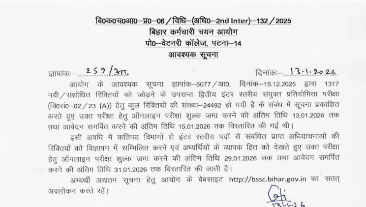 Job : बीएसएससी इंटर स्तरीय भर्ती 2026: आवेदन की अंतिम तिथि बढ़ी, अब 29 जनवरी तक मौकाबिहार कर्मचारी चयन आयोग ने इंटर स्तरीय भर्ती परीक्षा के लिए आवेदन की अंतिम तिथि बढ़ा दी है। जो अभ्यर्थी किसी कारणवश पहले आवेदन नहीं कर पाए थे, उन्हें अब दोबारा अवसर दिया गया है। आयोग की ओर से जारी सूचना के अनुसार इच्छुक और योग्य अभ्यर्थी 29 जनवरी 2026 तक ऑनलाइन आवेदन कर सकते हैं।