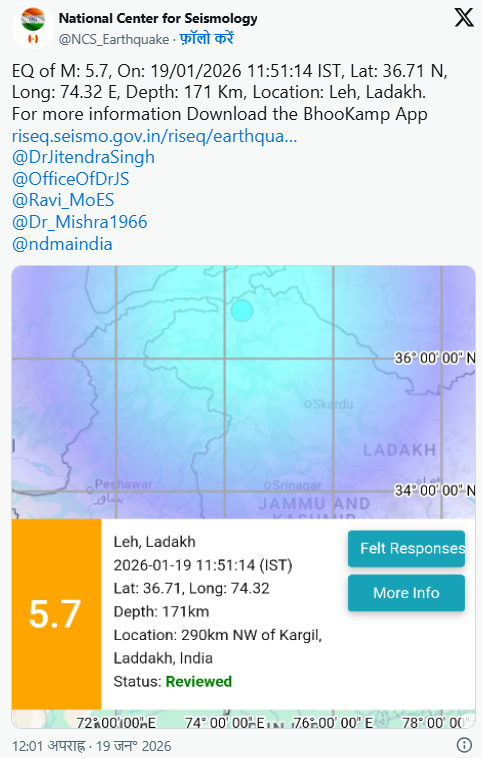 Ladakh भारत के केंद्रशासित प्रदेश लद्दाख के लेह में सोमवार दोपहर तेज भूकंप के झटके महसूस किए गए। नेशनल सेंटर फॉर सिस्मोलॉजी की जानकारी के अनुसार भूकंप का समय दोपहर 11:56 बजे था और इसकी तीव्रता रिक्टर पैमाने पर 5.7 मापी गई। भूकंप का केंद्र धरती से 171 किलोमीटर की गहराई में स्थित था। हालांकि, इस भूकंप से किसी जान-माल की हानि की सूचना अभी तक नहीं मिली है।