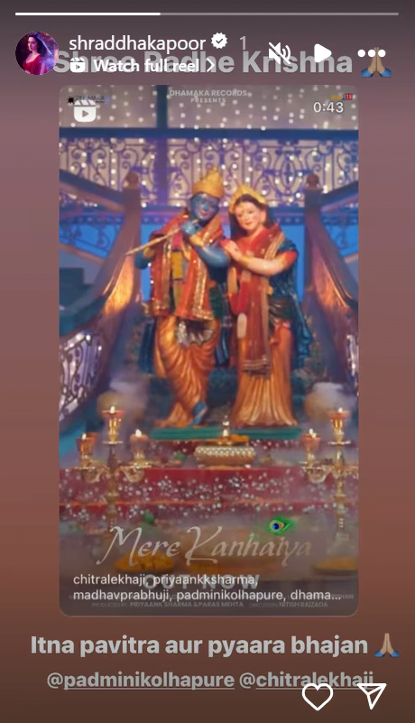 श्रद्धा कपूर ने कृष्ण जन्माष्टमी के मौके पर बहुत ही प्यारा सा भजन शेयर किया है, जिसमें भगवान बांसुरी बजाते हुए दिखाई दे रहे हैं और राधा उनके कंधे पर सिर टिकाकर खड़ी हैं।