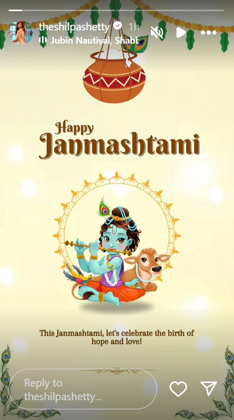 शिल्पा शेट्टी ने भी देशवासियों को जन्माष्टमी की शुभकामनाएं दी हैं और कान्हा जी का पोस्ट शेयर करते हुए लिखा, द जन्माष्टमी, इस मौके पर प्यार और आशा के साथ त्योहार मनाते हैं।