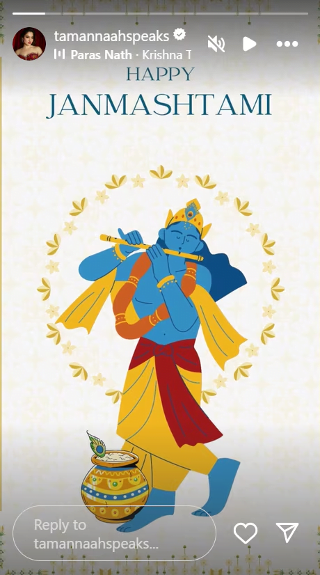 तमन्ना भाटिया ने कृष्ण जन्माष्टमी के खास मौके पर बांसुरी बजाते हुए श्रीकृष्ण का पोस्टर शेयर किया है और सभी को इसकी शुभकामनाएं दीं।