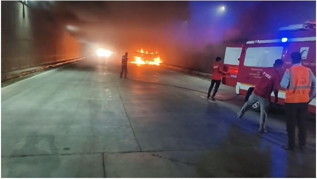 मुंबई: मुंबई-पुणे एक्सप्रेसवे पर स्थित खोपोली निकास के पास नई सुरंग में लोहे के केबल ले जा रहे एक ट्रक में अचानक आग लग गई। यह घटना आधी रात के आसपास हुई, जिससे सुरंग में भारी मात्रा में धुआं फैल गया और यातायात बाधित हो गया। सौभाग्य से इस घटना में कोई हताहत नहीं हुआ, लेकिन ट्रक के टायर और केबिन पूरी तरह जलकर खाक हो गए।