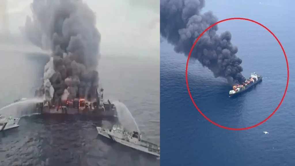 जहाज के मध्य हिस्से और कंटेनर स्टोरेज क्षेत्र से आग की लपटें उठ रही थीं। जहाज पर लोड किए गए दर्जनों कंटेनर जलते हुए दिखाई दिए। प्रत्यक्षदर्शियों के अनुसार, समुद्र में जहाज से लगातार धमाकों की आवाजें आ रही थीं, जिससे आसपास दहशत का माहौल बन गया।
