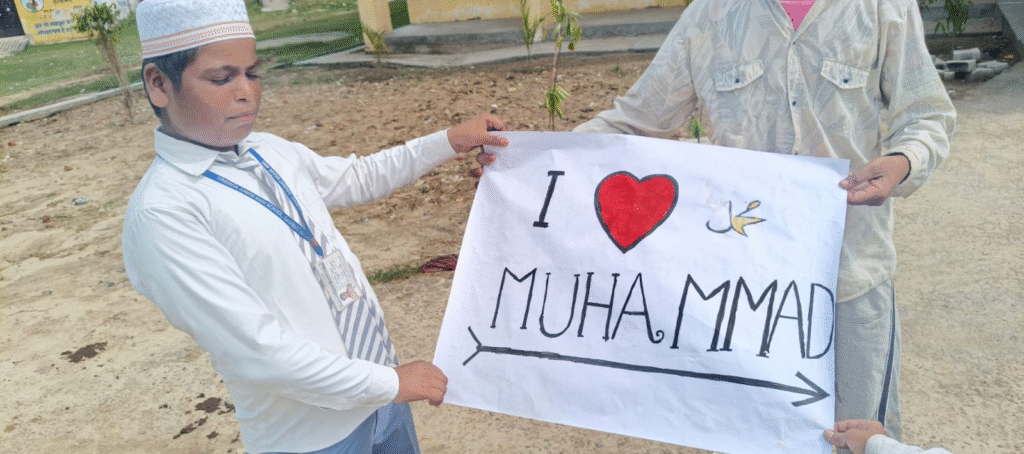 मुरादाबाद: देश के विभिन्न हिस्सों में आई लव मोहम्मद को लेकर विवादित टिप्पणियाँ और प्रदर्शन आम हैं, लेकिन मुरादाबाद में एक स्कूल से सामने आई घटना ने नया विवाद खड़ा कर दिया है। मुरादाबाद के थाना भोजपुर क्षेत्र के गांव गनीमत नगर में स्थित हबीबिया जूनियर हाई स्कूल में मुस्लिम बच्चों से “आई लव मोहम्मद” चार्ट बनवाने और पोस्टर के रूप में तैयार करवाने का मामला सामने आया है। इस घटना का वीडियो सोशल मीडिया पर तेजी से वायरल हो रहा है। हमारी रिपोर्ट टीम जब स्कूल पहुंची, तो स्कूल ऑफिस में मेज पर “आई लव मोहम्मद” का पोस्टर देखा गया। बच्चों के हाथों में चार्ट भी थे। पत्रकारों को देखने के बाद स्कूल की छुट्टी करा दी गई और अध्यापक कैमरे से बचते नजर आए। लेकिन टीम के कैमरे में कई प्रकार के सबूत कैद हो गए। कुछ बच्चों ने कैमरे पर खुलासा किया कि अध्यापकों ने जानबूझकर चार्ट बनवाए और बच्चों को पोस्टर दिखाने के लिए कहा। वहीं अध्यापकों ने ऐसा करने से इनकार किया और कहा कि यह गुनाह नहीं है।