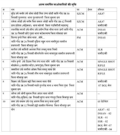 • नवीन नुप्पो उर्फ हिडमा पिता नंगा माता बीमे जाति गोंड उम्र 30 निवासी बोडकेल तहसील कोंटा (जगरगुंडा) जिला सुकमा छग।