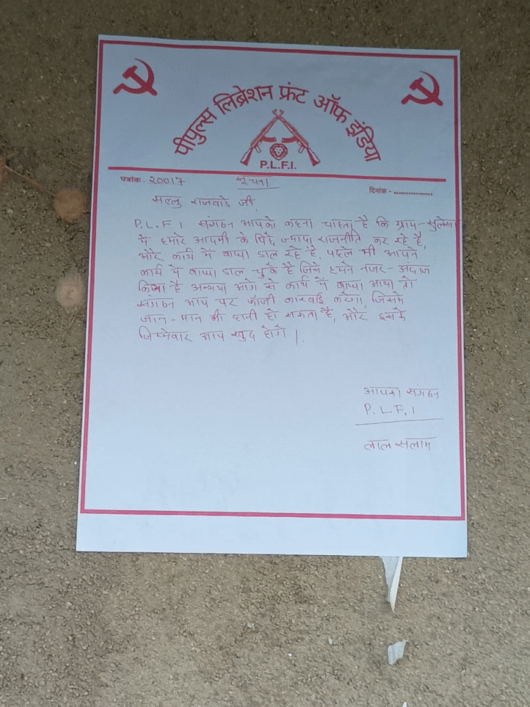 जशपुर: जिले में नक्सलियों की धमकी भरी हरकत से एक बार फिर दहशत फैल गई है। पंड्रापाठ चौकी क्षेत्र के सुलेसा गांव में पीएलएफआई संगठन (People’s Liberation Front of India) के नाम पर एक धमकी भरा पर्चा ग्रामीण के घर की दीवार पर चिपकाया गया है। जानकारी के मुताबिक, यह पर्चा ग्रामीण सल्लू राजवाड़े के घर की दीवार पर लगाया गया था। इसमें नक्सलियों ने चेतावनी देते हुए लिखा है कि जो लोग हमारे काम में रोड़ा बनेंगे, उन्हें जान-माल का नुकसान झेलना पड़ेगा।