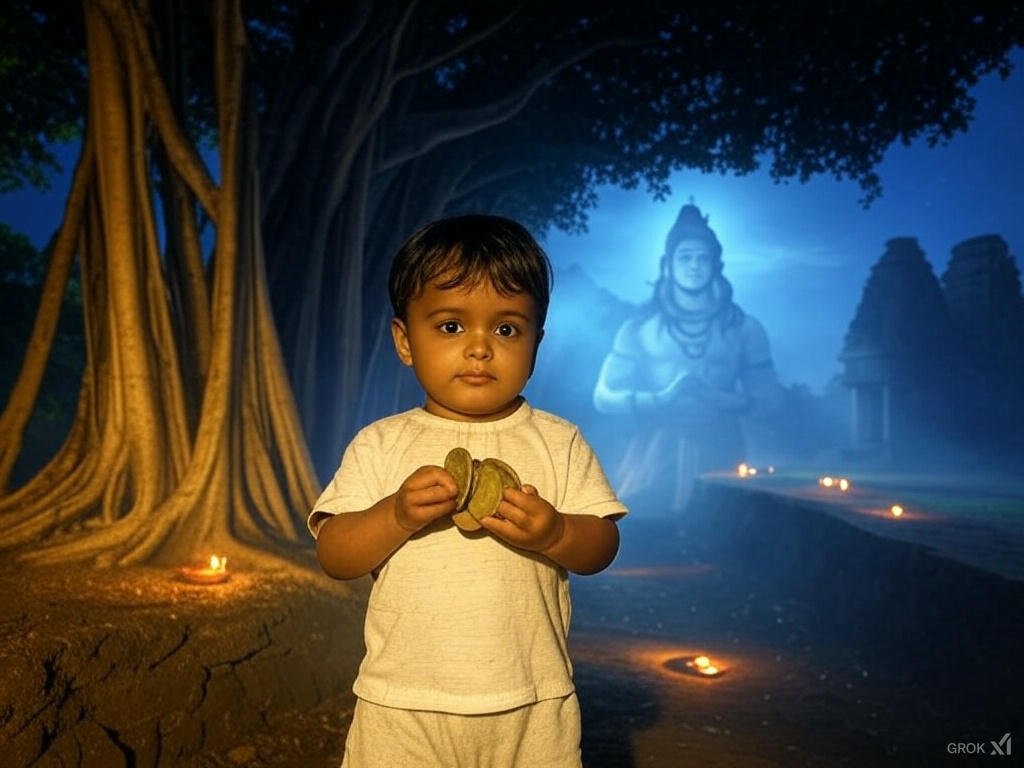 महाशिवरात्रि की रात थी। मेला अपने चरम पर था—हवा में कपूर और चंदन की खुशबू, भक्तों के भजनों की मिठास, और मंदिर की घंटियों का ऐसा संगीत जो आत्मा को झकझोर दे। रंग-बिरंगे झंडे हवा में लहरा रहे थे, और दूर-दूर से आए लोग शिव के दर्शन के लिए बेताब थे। इस भीड़ में एक नन्हा साहसी, मुन्ना, अपनी चपलता और उत्साह के साथ इधर-उधर दौड़ रहा था। उसकी माँ की पुकार, “मुन्ना, पास रहो!” उसके कानों तक पहुंचती, पर उसका मन मानो किसी अनजान зов की ओर खिंच रहा था।