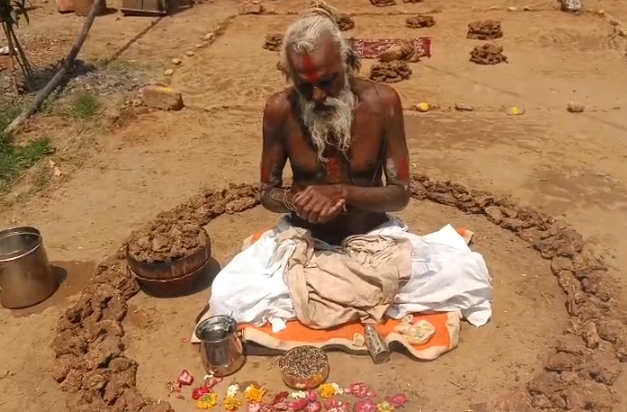 - संत अग्नि के चारों ओर बैठकर, सिर पर जलते हुए खप्पर में कंडे रखकर तप कर रहे हैं।