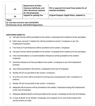 सैलरी और शुल्क: इस पद पर चयनित उम्मीदवारों को महीने के 45,000 रुपए वेतन के हिसाब से भुगतान किया जाएगा। इसके अलावा उम्मीदवारों से कुछ शुल्क भी लिया जाएगा। भर्ती विज्ञापन के अनुसार, 30,000 रुपए + 18% GST (5,400 रुपए) फीस के रूप में ली जाएगी, जिसमें जॉइनिंग टिकट शामिल है। इसके अलावा, मेडिकल टेस्ट के लिए उम्मीदवारों को 1,500 रुपए अतिरिक्त देने होंगे।