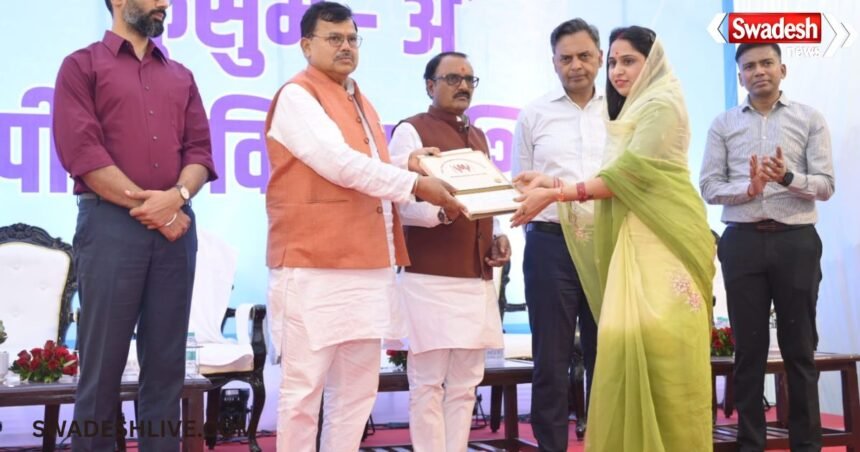 ऊर्जा मंत्री श्री प्रद्युम्न सिंह तोमर तथा नवीन एवं नवकरणीय ऊर्जा मंत्री श्री राकेश शुक्ला द्वारा प्रधानमंत्री किसान ऊर्जा एवं उत्थान महाअभियान (पीएम-कुसुम) योजना के घटक ‘ए’ के अंतर्गत योजना के तीसरे चरण के अंतर्गत शुक्रवार को कार्यक्रम में निष्पादित विद्युत क्रय अनुबंध को 220 हितग्राहियों के मध्य वितरित किया।