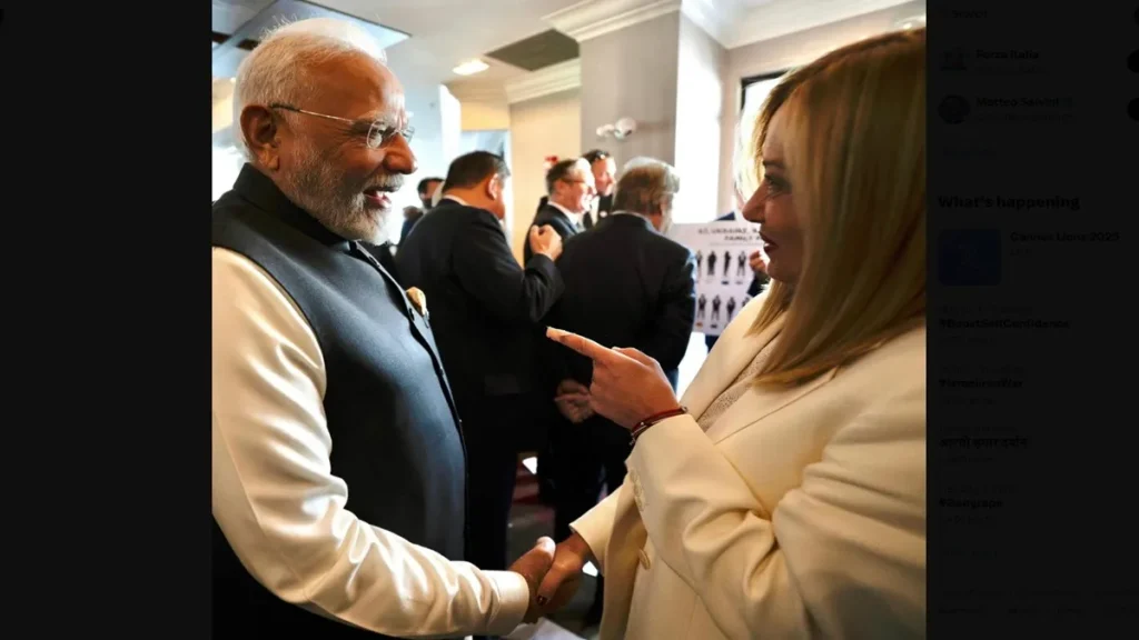 प्रधानमंत्री मेलोनी ने G7 सम्मेलन के दौरान प्रधानमंत्री मोदी से मुलाकात की एक तस्वीर X (पूर्व ट्विटर) पर साझा करते हुए लिखा:
